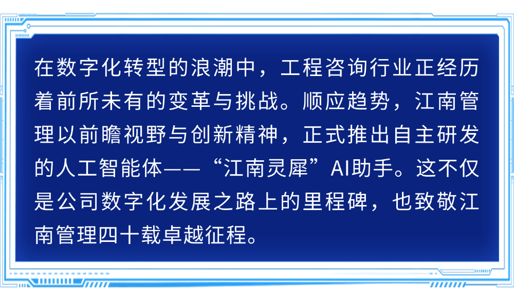 未来,江南管理将继续依托即将推出的“江南灵犀”平台,把人工智能技术融入全过程工程咨询业务链条,打造智慧化、高效化的服务平台,探索前沿科技在工程咨询领域的更多可能,为客户创造更大的价值。