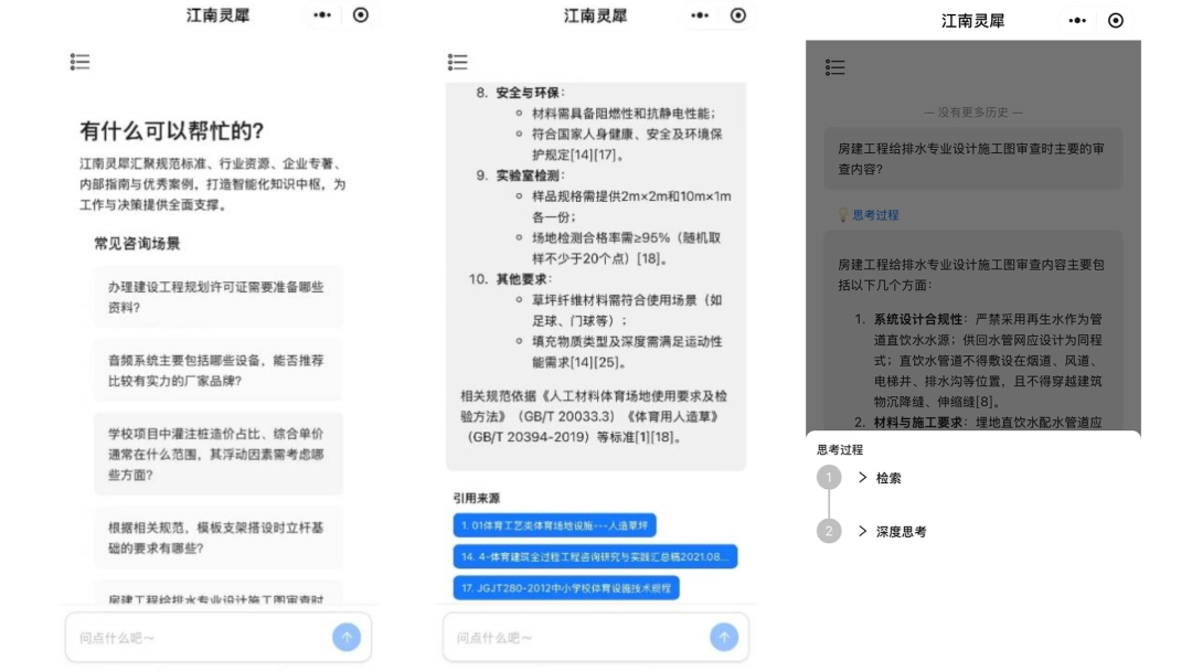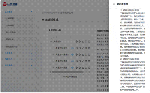 “江南灵犀”AI助手从全过程咨询服务成果入手,将逐步覆盖项目策划、规划、设计、招采、施工到运维各个阶段,从客户需求出发,通过问答式、诊断式互动提供帮助。无论是复杂项目的过程管理,还是精细化的成本控制,“江南灵犀”都将结合企业大量的历史数据知识积累,科学智能地赋能前端,提升工作效率和服务质量。